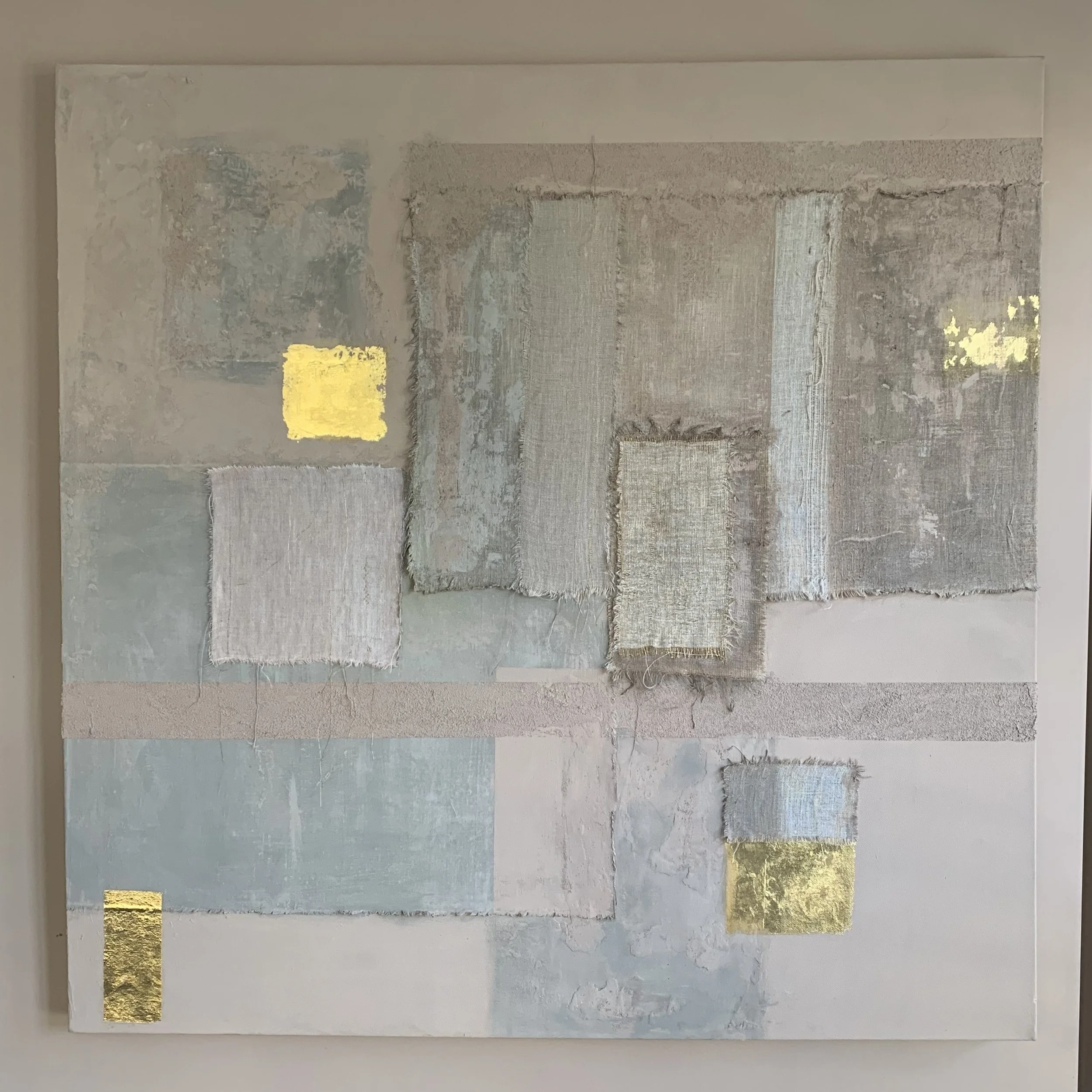 Mixed Media van acryl, kalk, medium, goudmetaal en linnen stof op canvas doek.
