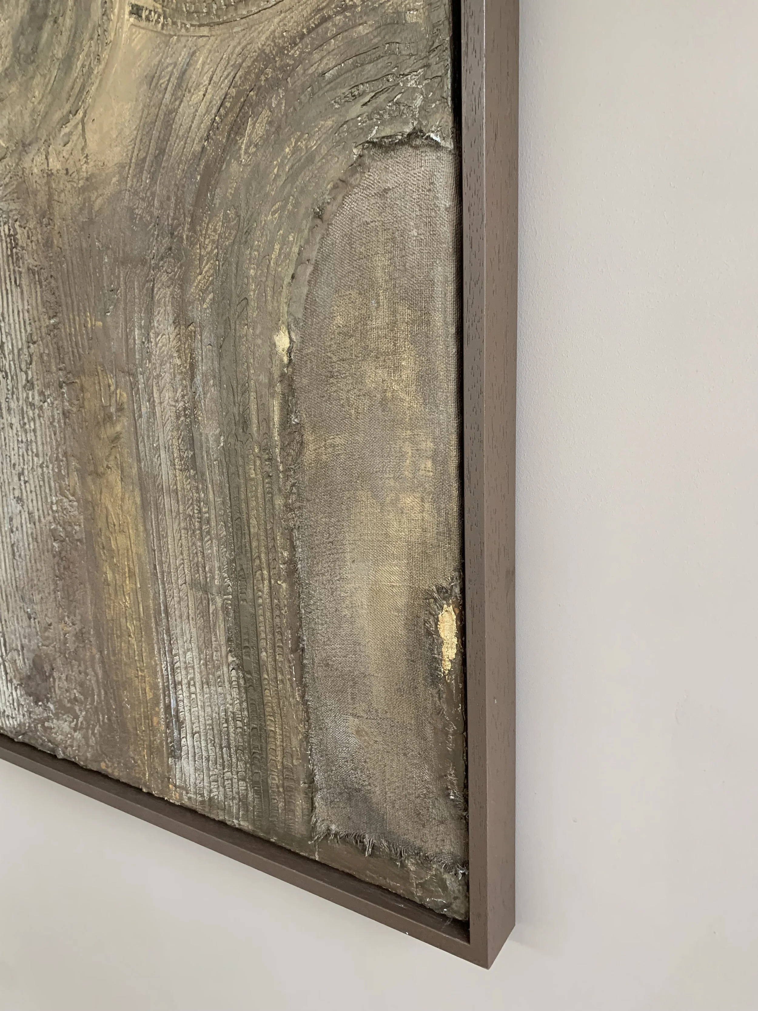 Mixed Media in bruin/brons/grijs/goudtinten op doek met baklijst.