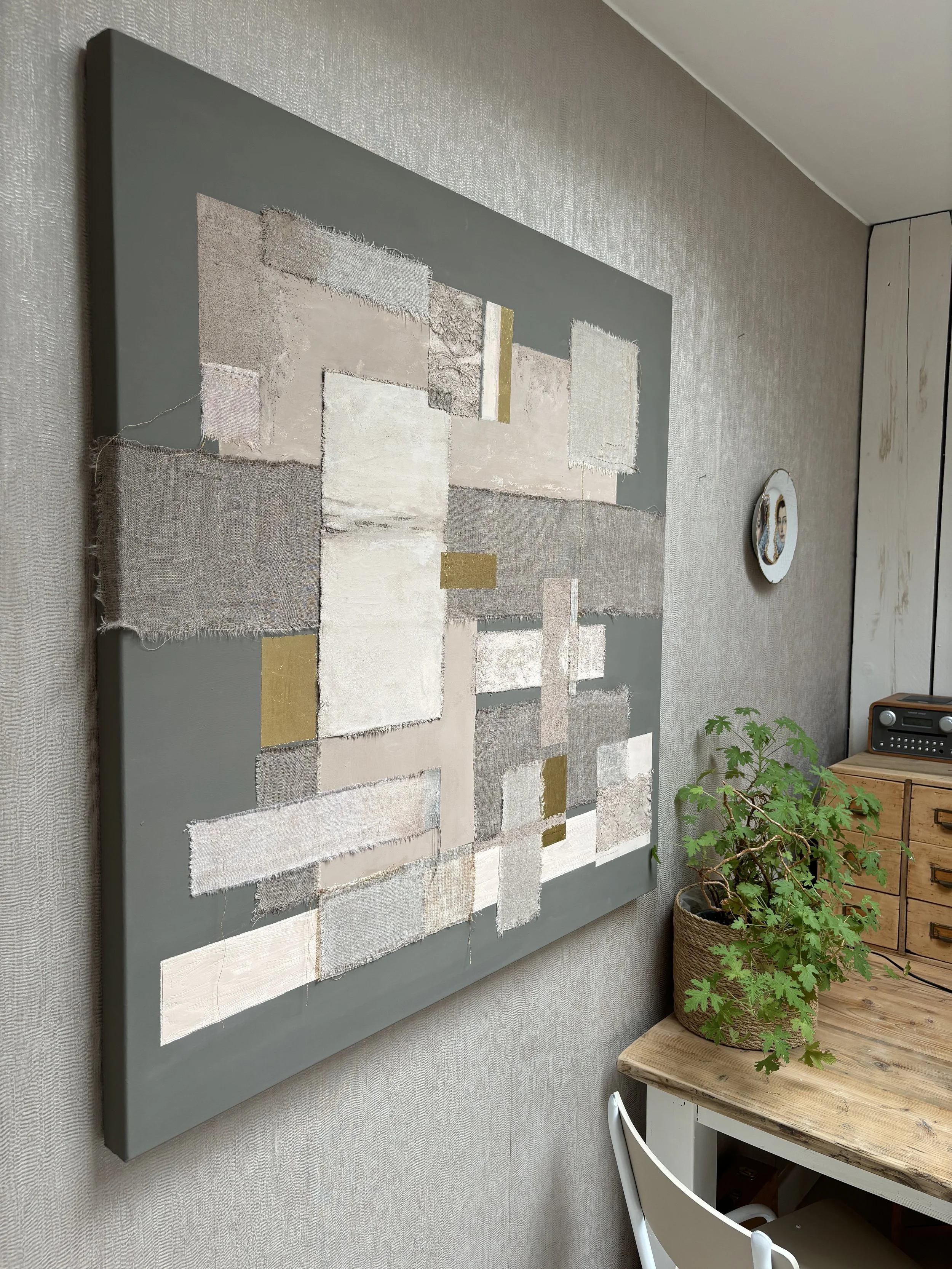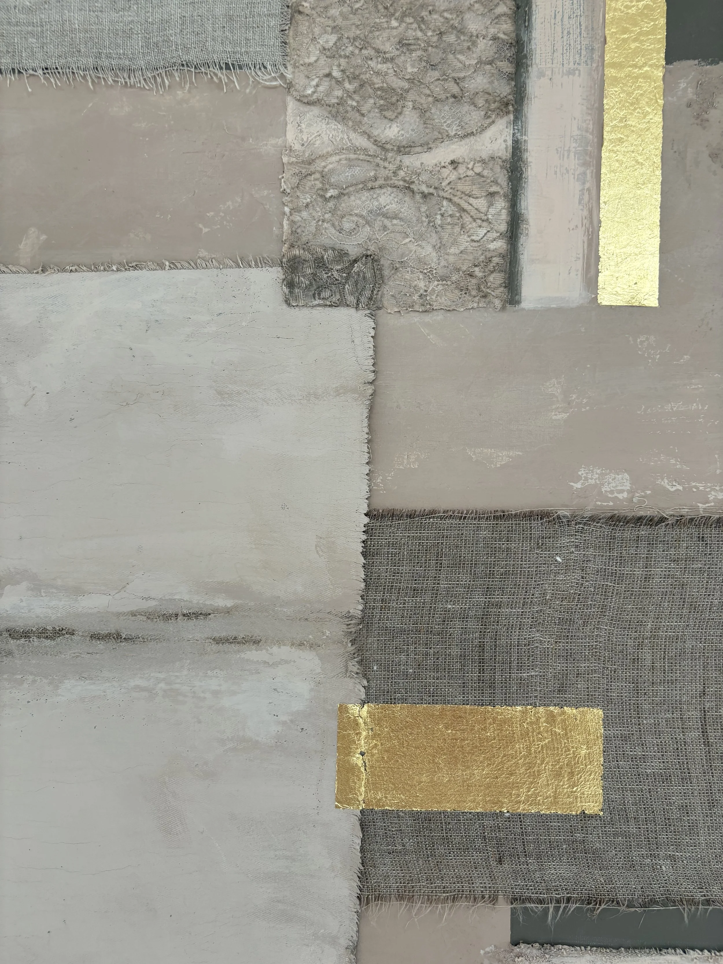 Mixed Media van acryl, minerale verf, gouddraad, goudmetaal en diverse stofjes en kant op canvas doek.