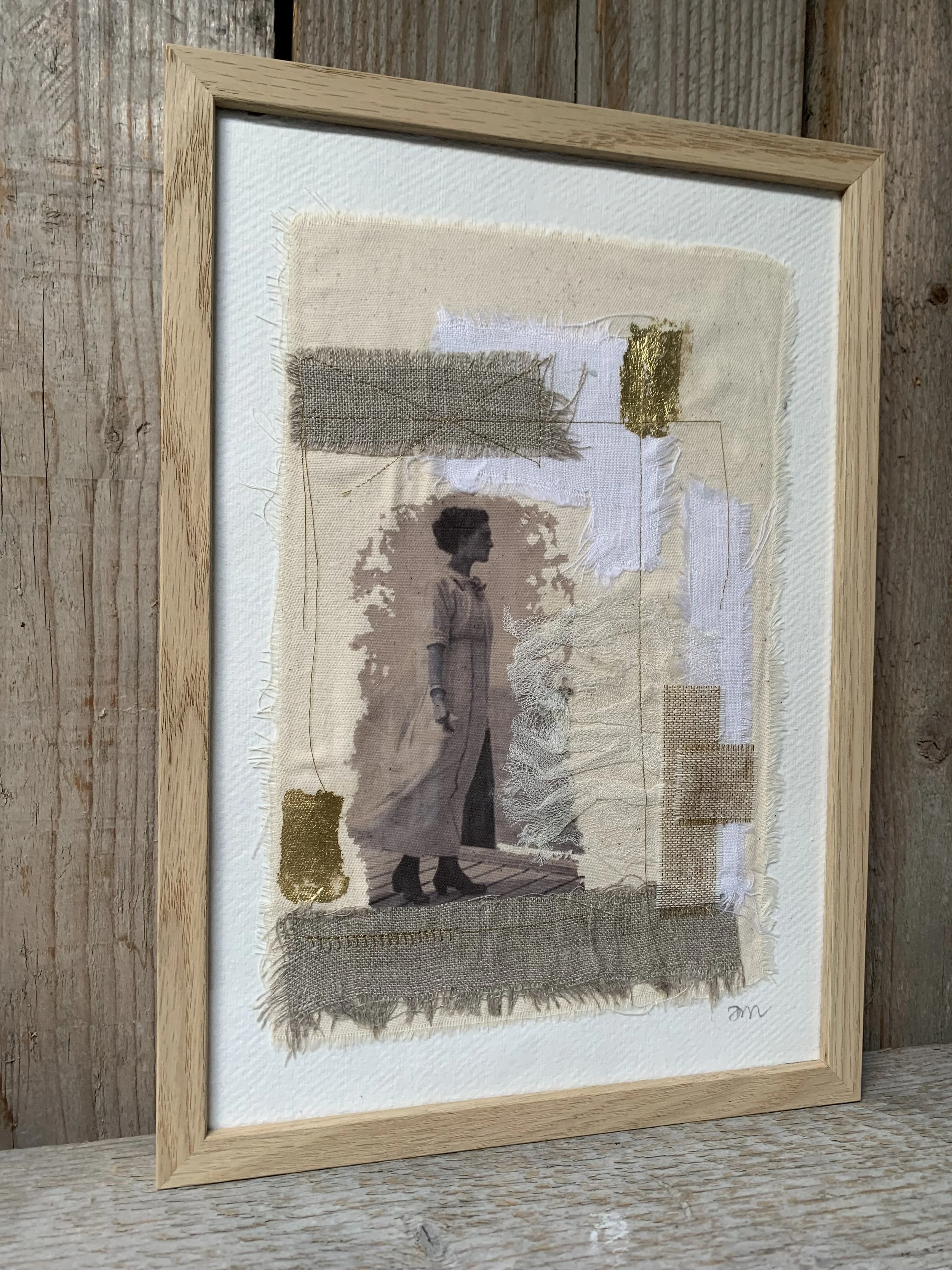 Met print, antieke stofjes, linnen, bladgoud en gouddraad.