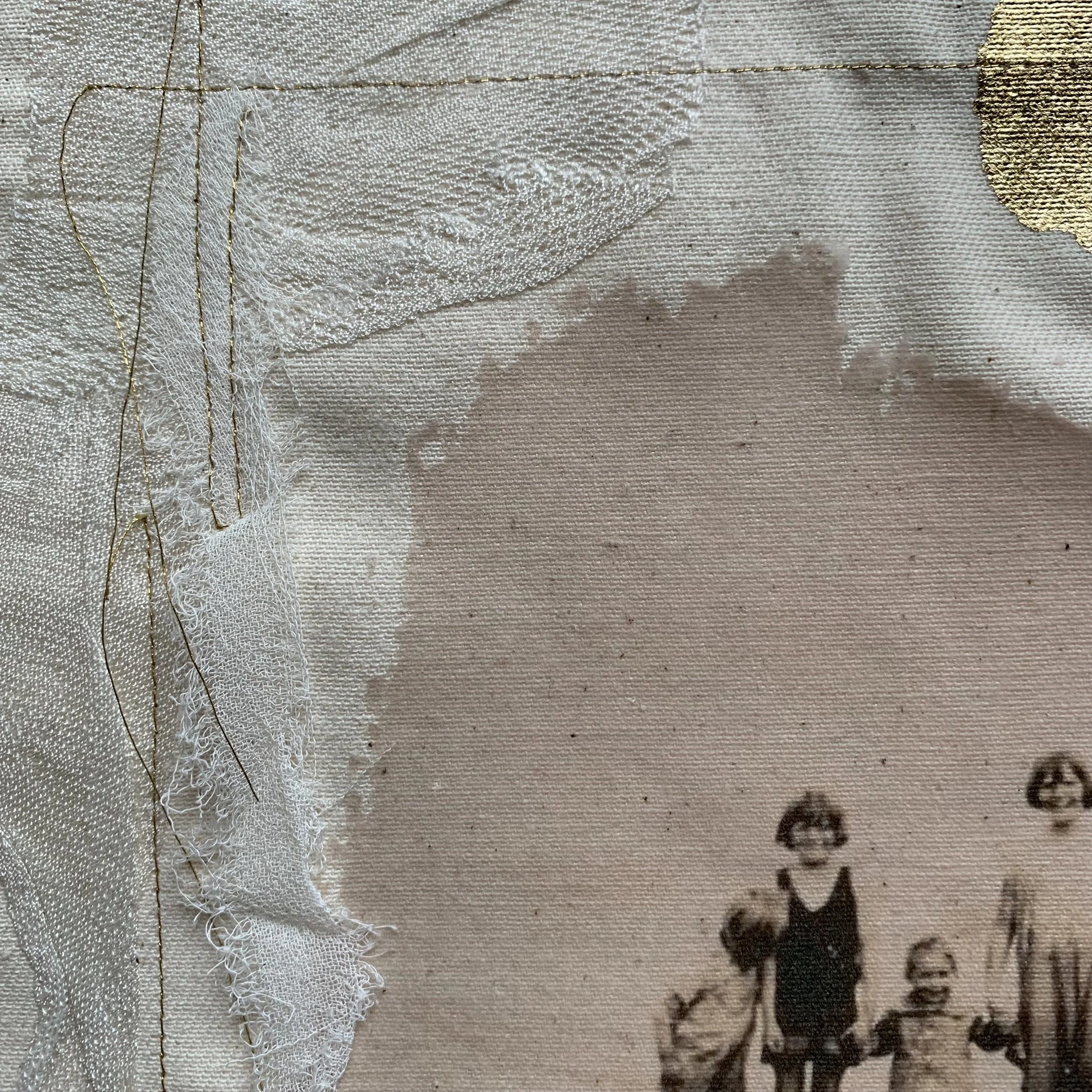 Met print, antieke stofjes, linnen, bladgoud en gouddraad.