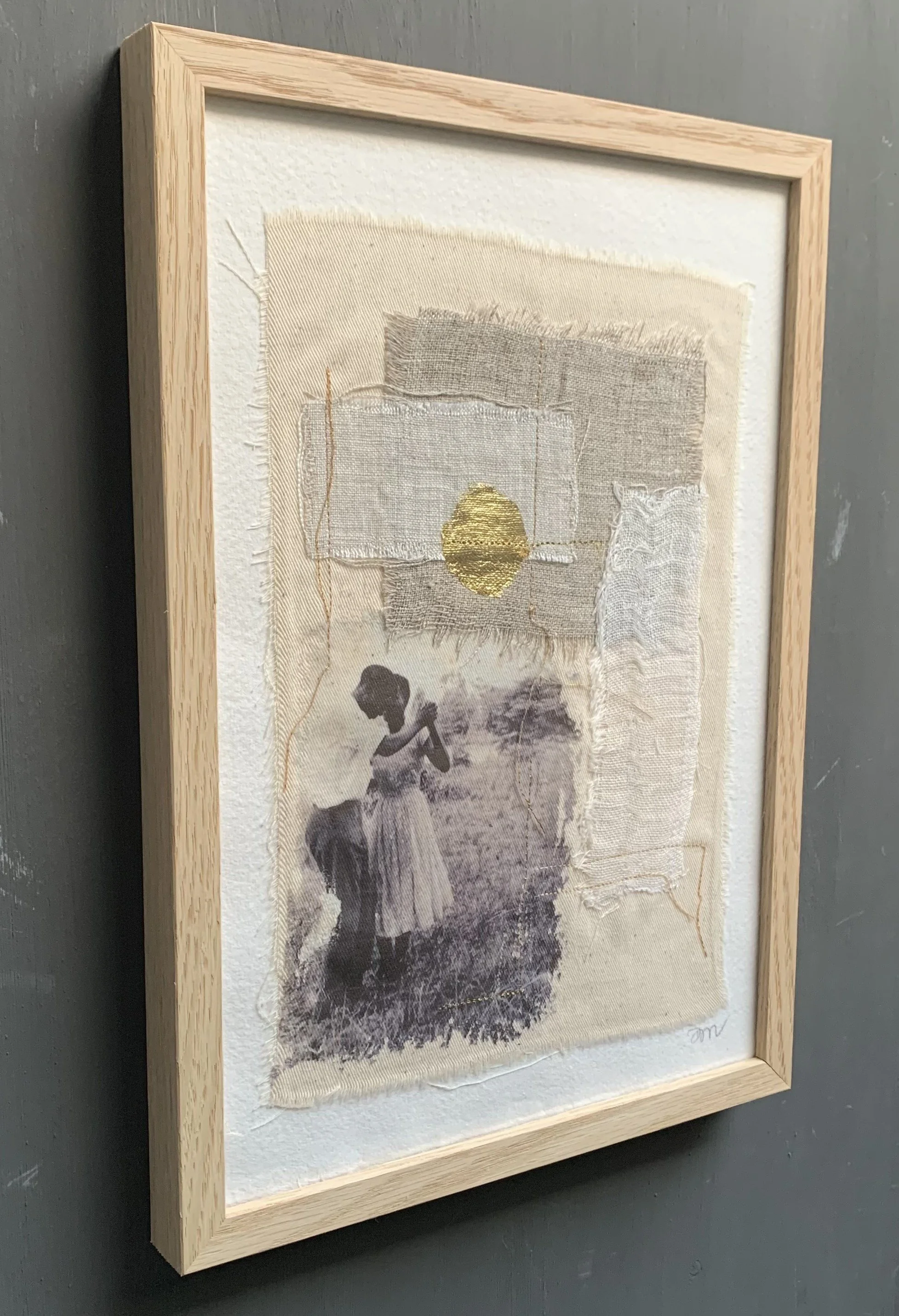 Met print, antieke stofjes, linnen, bladgoud en gouddraad.