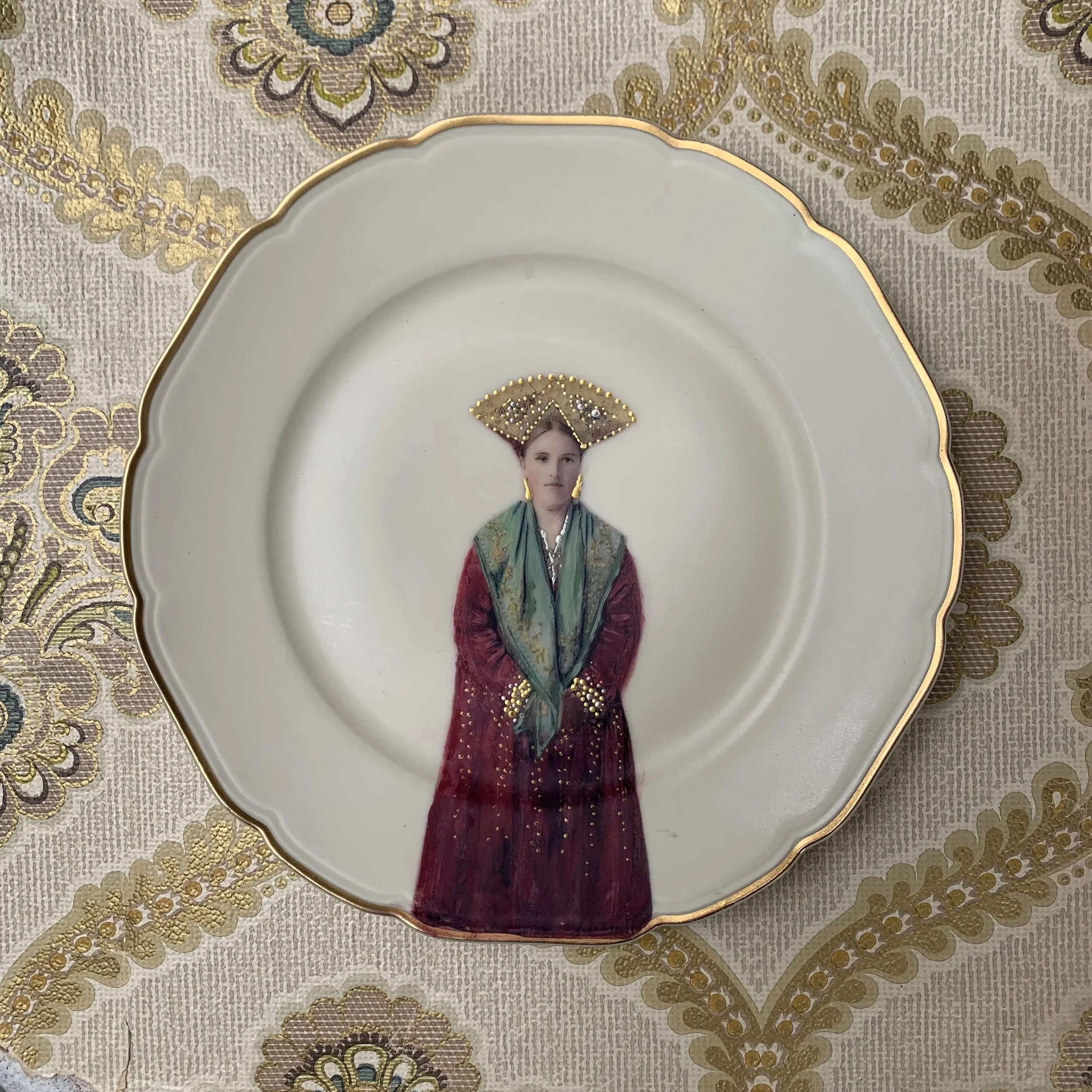 Vintage sierbord gedecoreerd met afbeelding en porseleinverf. Inclusief bordenhanger.