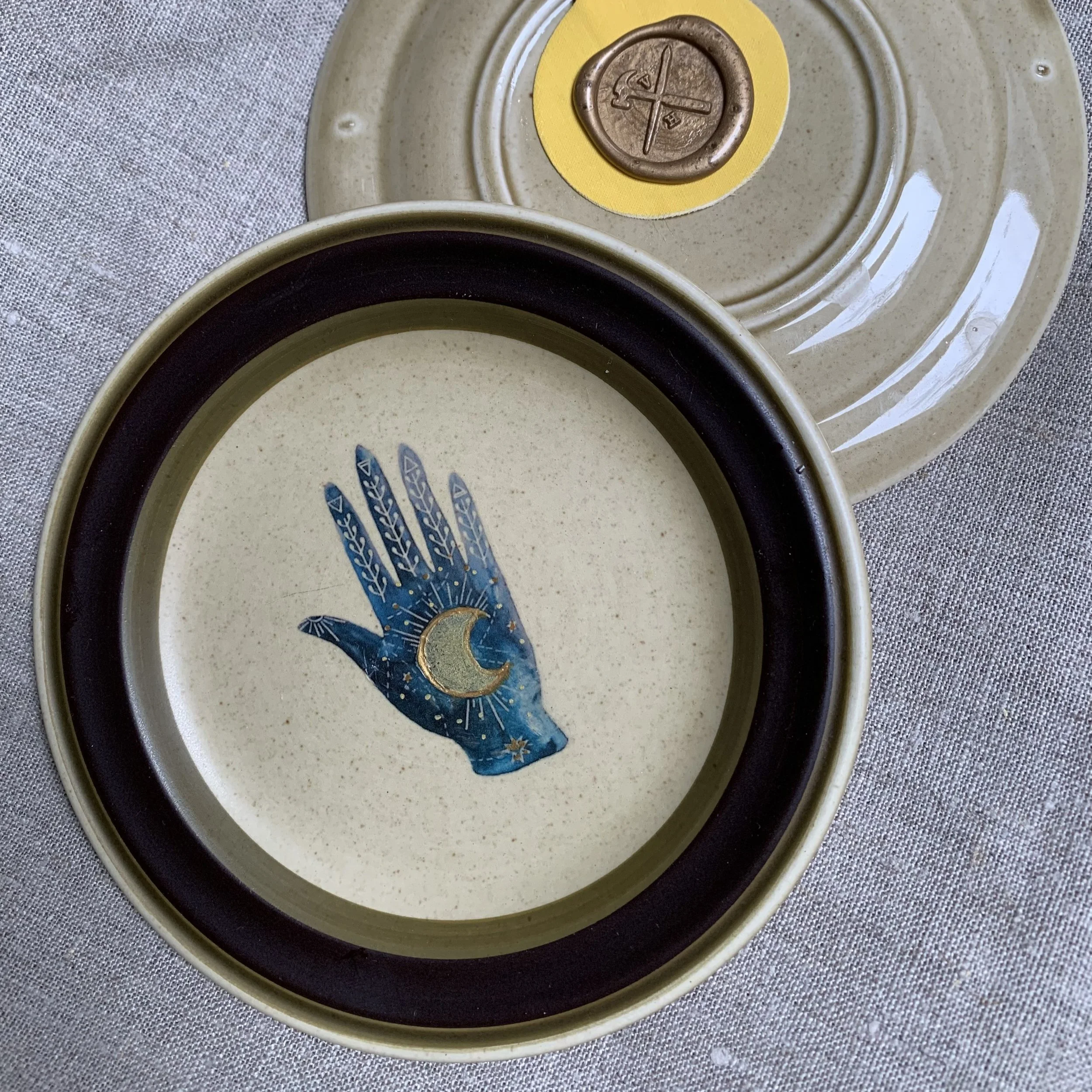 Vintage sierbordje gedecoreerd met afbeelding en porseleinverf. Inclusief bordenhanger aan achterzijde.
