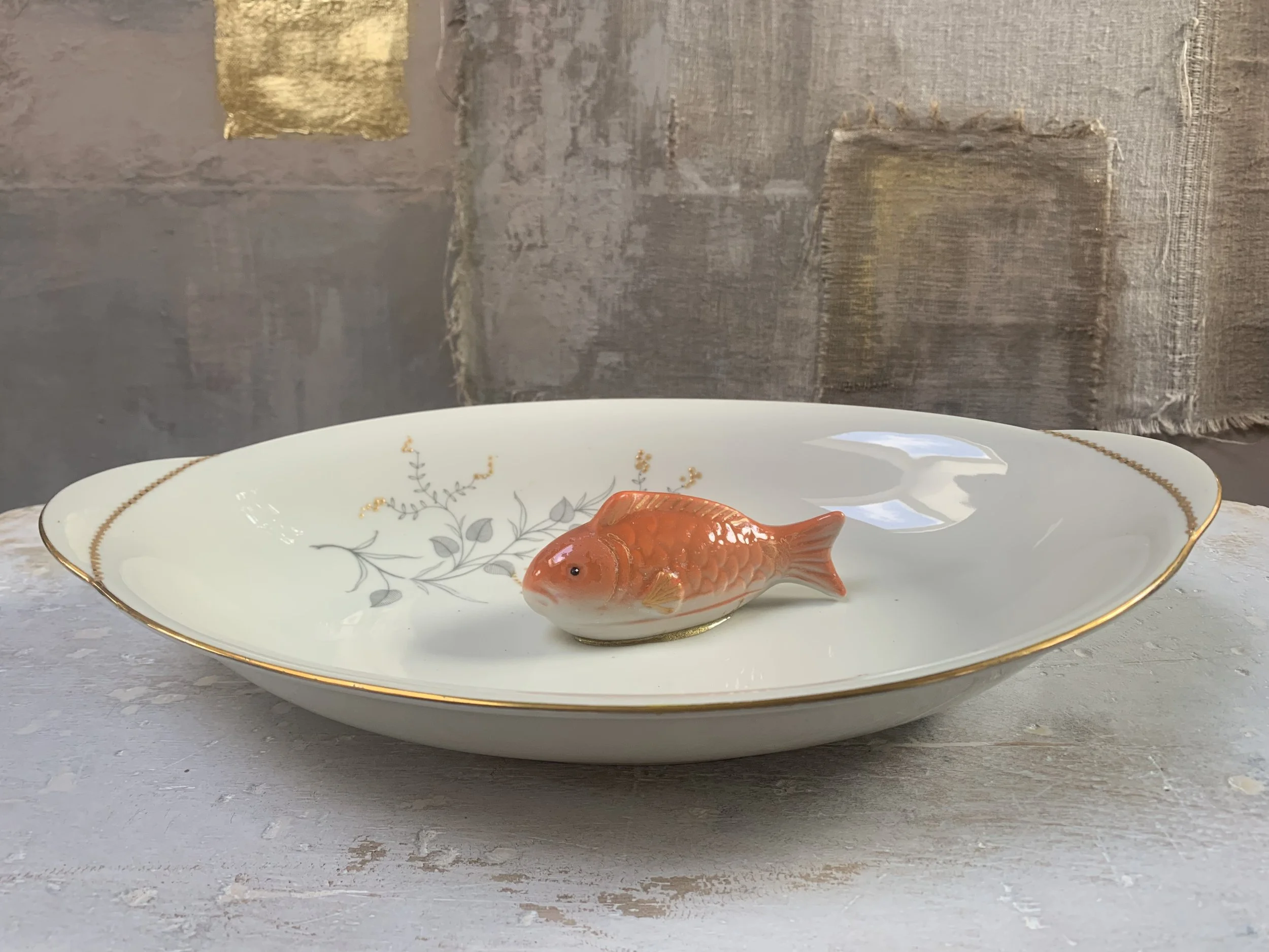 Vintage schaal gedecoreerd met porseleinverf en goudvis van aardewerk bevestigd met Kintsugi (金継ぎ: 'gouden verbinding.)